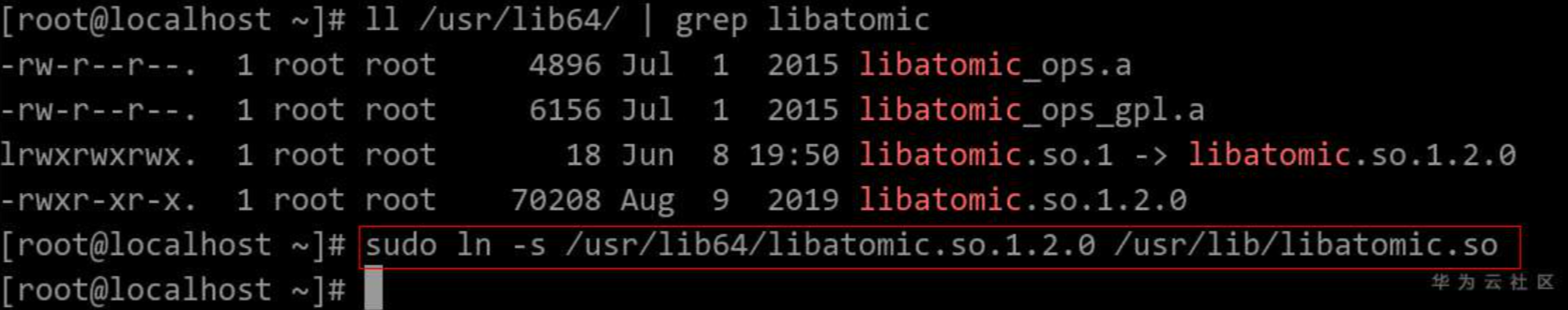 使用软链接的方法将依赖库libatomic.so链接到正确路径,执行如下命令: